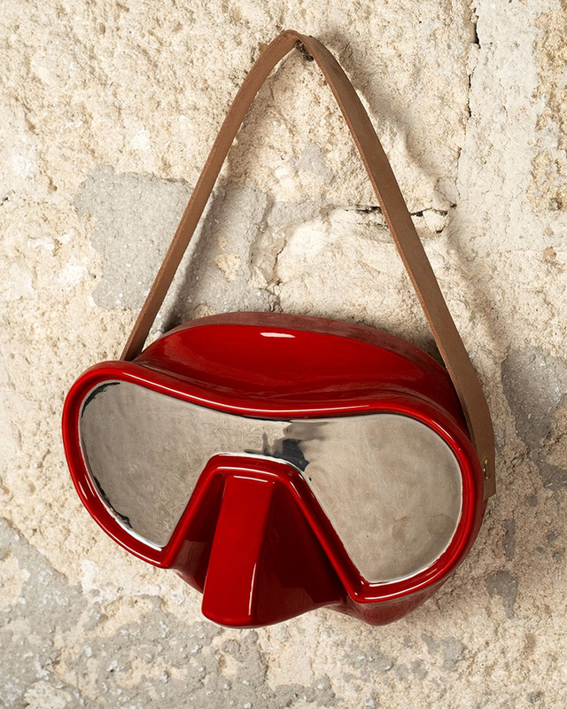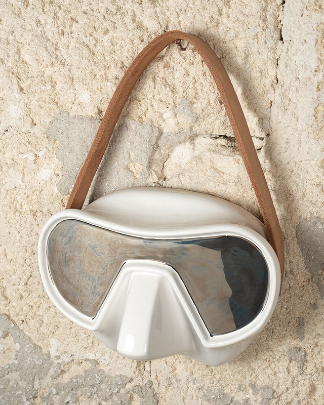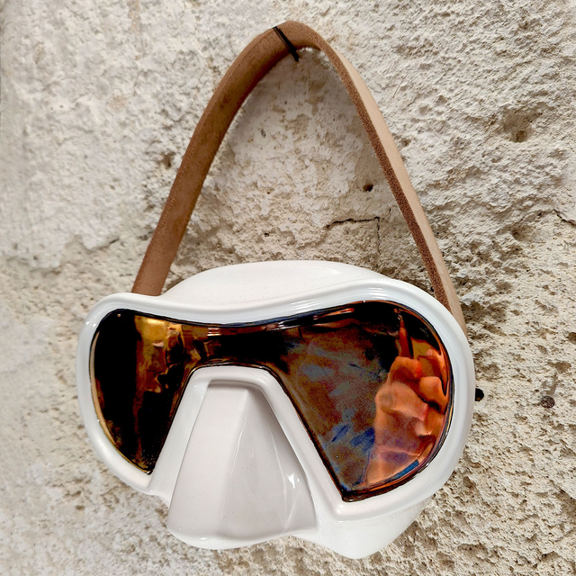 Oggetto in ceramica bianca cotto la prima volta a 1040°C, smaltata in diverse colorazioni cotto una seconda volta a 950°C, qui proposto nella variante con lustro bronzo o platino fissato con una terza infornata a 750°C. Una fascia in cuoio bloccata con punti in ottone lucido completa la maschera per poter essere appesa