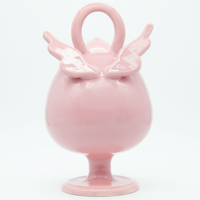 Realizzato da Elia Studio Lab in ceramica bianca cotta a 1060°C, smaltato e cotto una seconda volta a 960°C che gli conferisce la colorazione rosa lucido